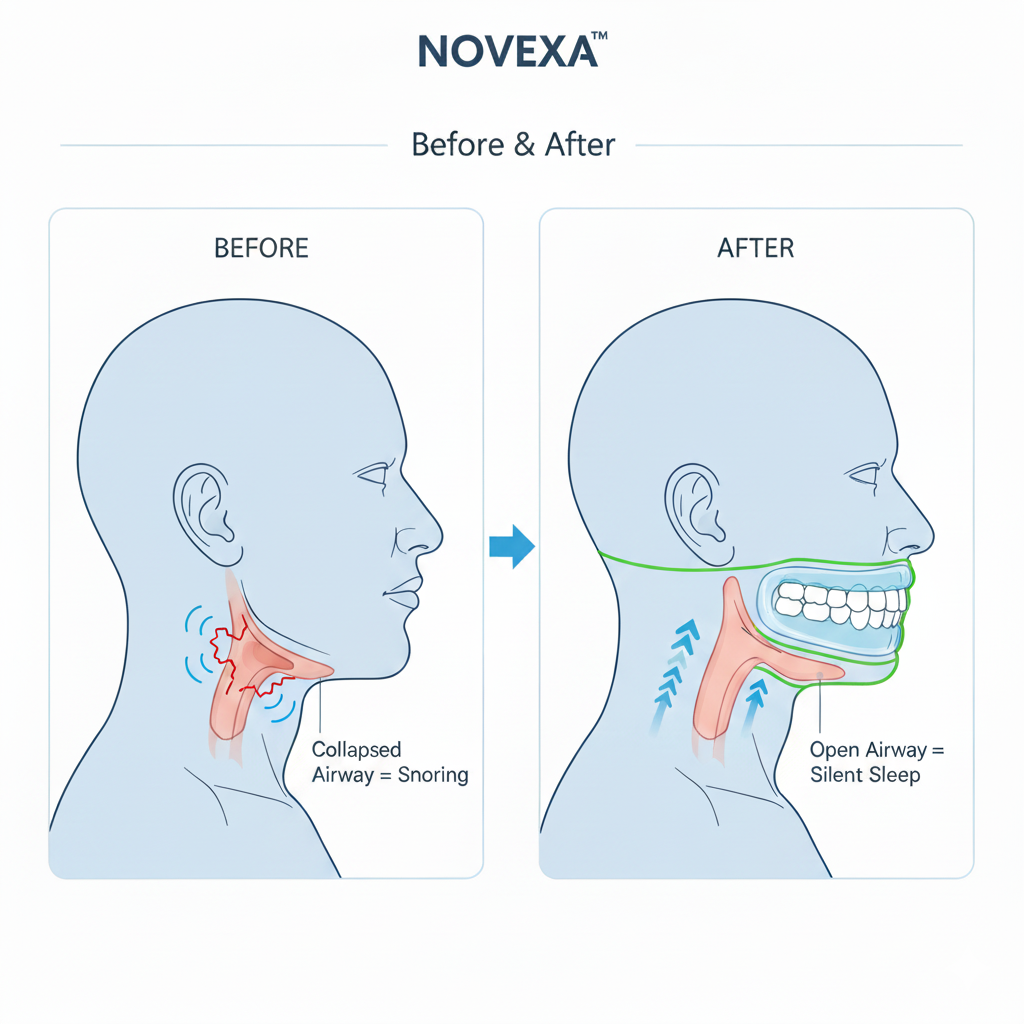 The Solution: The Novexa™ Mouth Guard gently holds your lower jaw in a slightly forward position.
